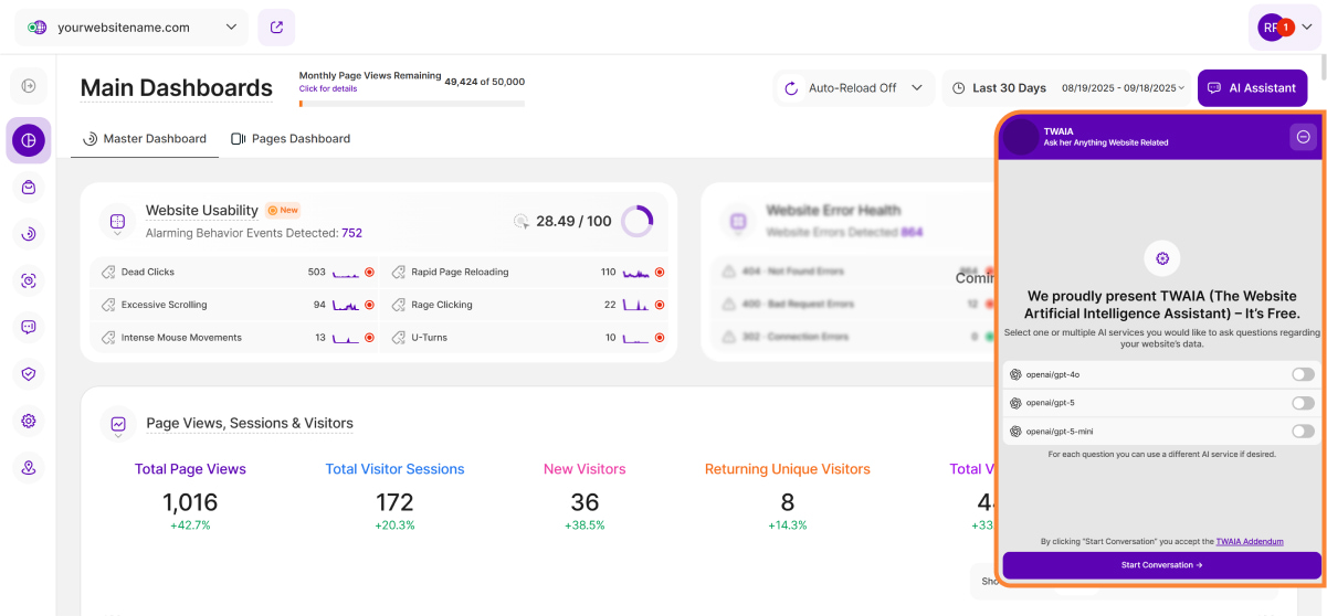 The AI Assistant button is in the top-right corner of the dashboard, right next to the date picker. When clicked, this button will open a modal sliding in from the right that hosts TWAIA, our AI-powered platform assistant.