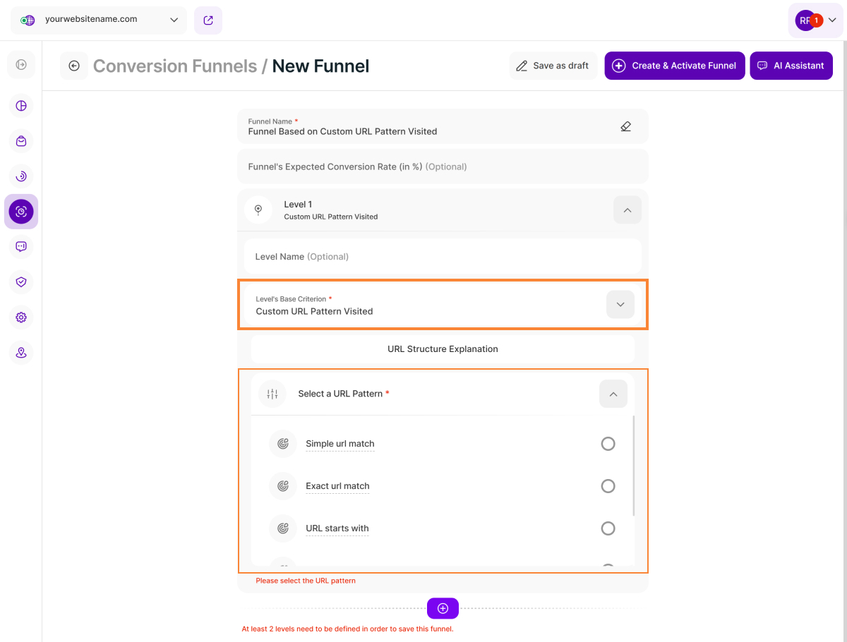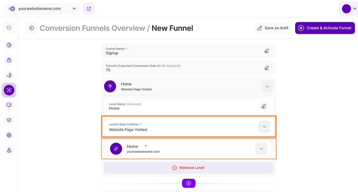 Note: You need to define at least two levels to save your funnel. For the subsequent level (Level 2), you can either choose Website Page Visited again or explore our other available base criteria.