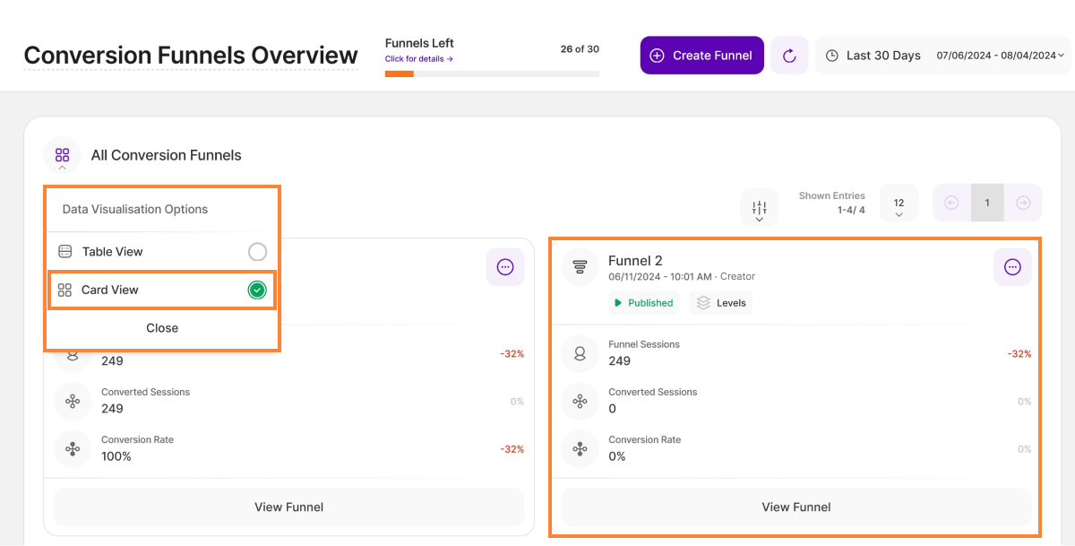 You can customize the view setting of the funnel overview by tapping the menu icon at the top left of this report block and then selecting “Card View” from the dropdown list. Instead of the default, which is the table view, you will now see the conversion funnels individually displayed on each card.