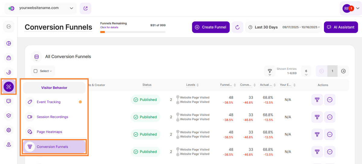 - Published: Funnels that have been published and gathering data. Note that unlike heatmaps, there is NO possibility to pause the collection of data.