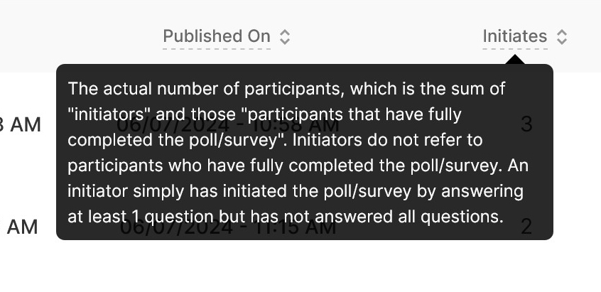 - Initiates: The actual number of participants, which is the sum of "initiators" and those "participants that have fully completed the poll/survey". Initiators do not refer to participants who have fully completed the poll/survey. An initiator simply has initiated the poll/survey by answering at least 1 question but has not answered all questions.