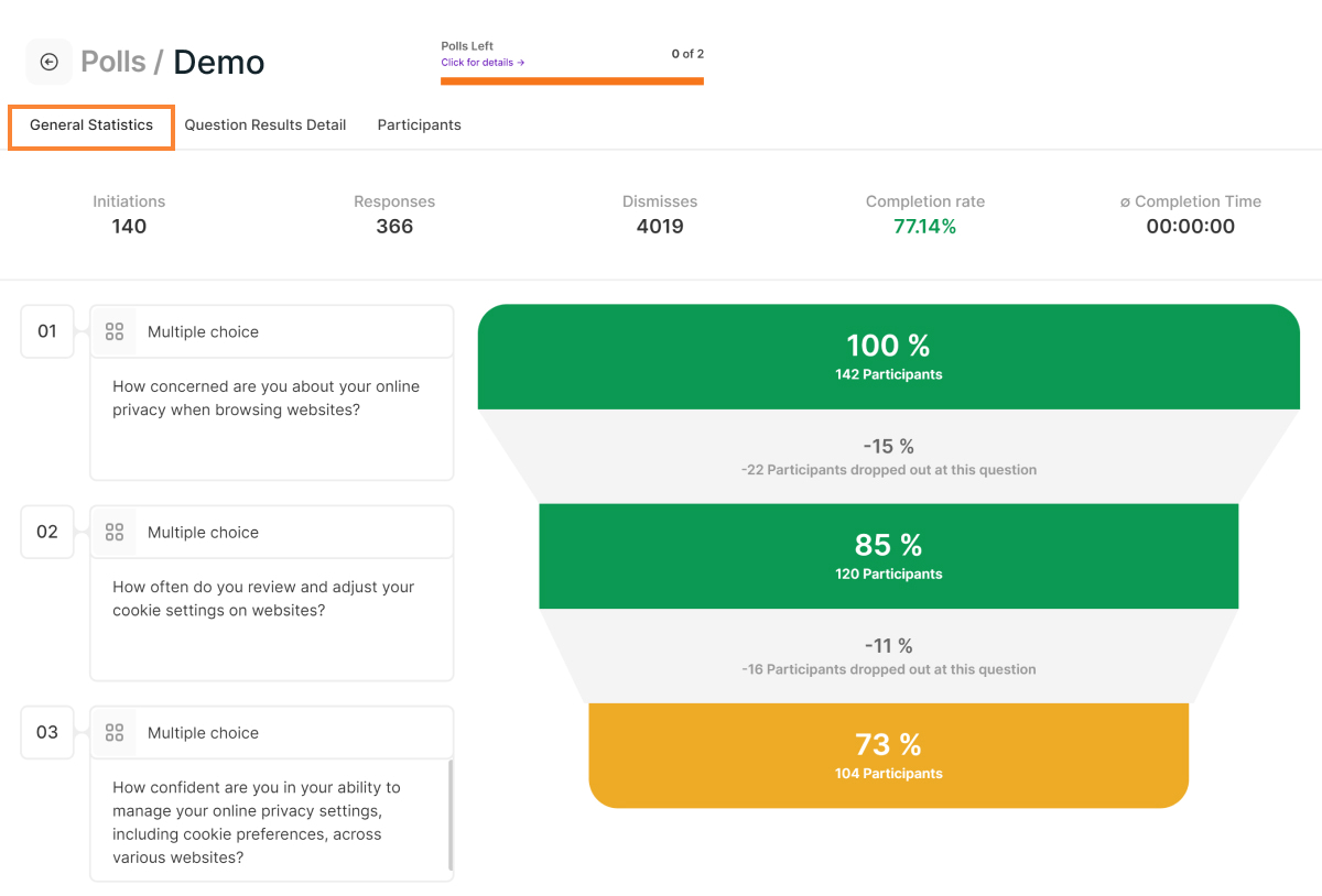 - Completion Rate: The ratio of participants that finished all questions of a poll/survey in comparison to the amount of people that replied to at least one question. Hint: You can also check each participant's completion rate individually within the participants table.