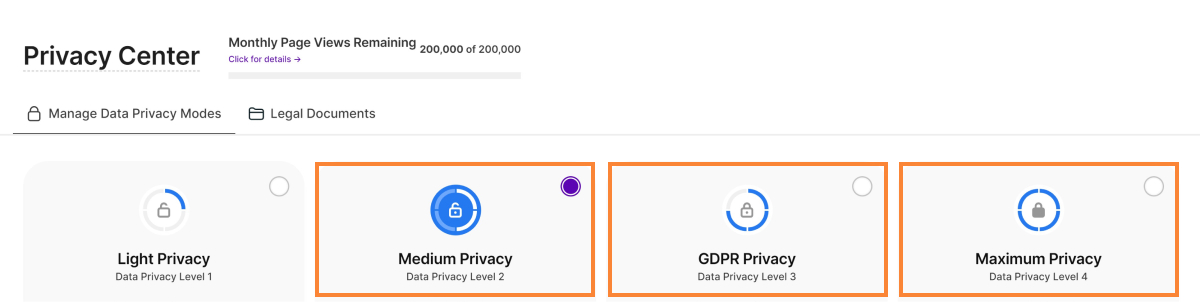 - Navigate to the Privacy Center. You can choose from any of these three data privacy modes: