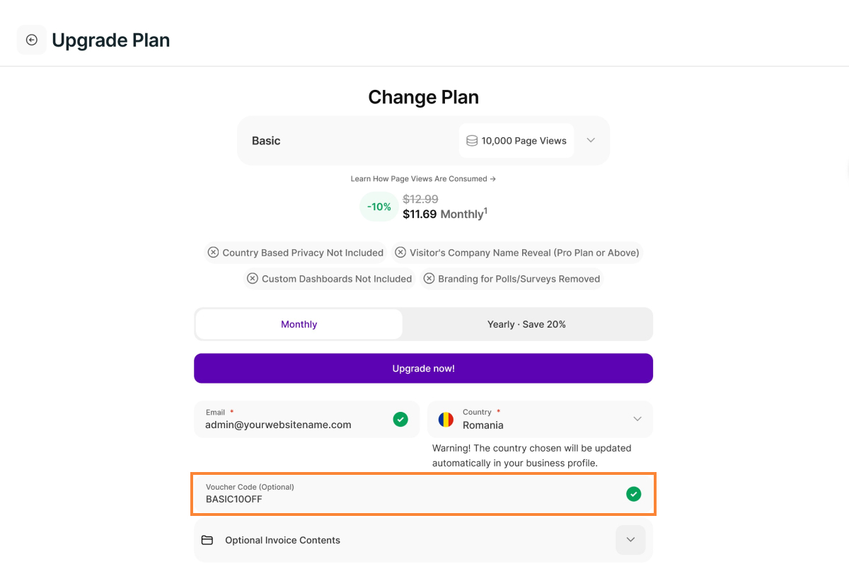 What we can do instead is to offer you a discount for purchasing any of our plans, if you have our app installed on your website and you want to upgrade. We can offer you a 20% OFF on your first billing cycle, for any of the selected subscription.