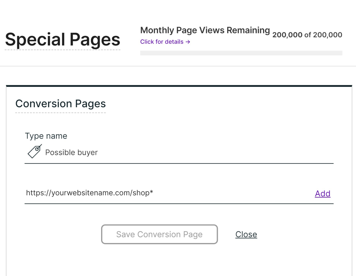 Also, if you have "thank you for your purchase" page, you can set it as conversion named "loyal customer". If a visitor is reaching more types of conversions you can see them within the list o visitors as: Conversion types: possible buyer, loyal customer