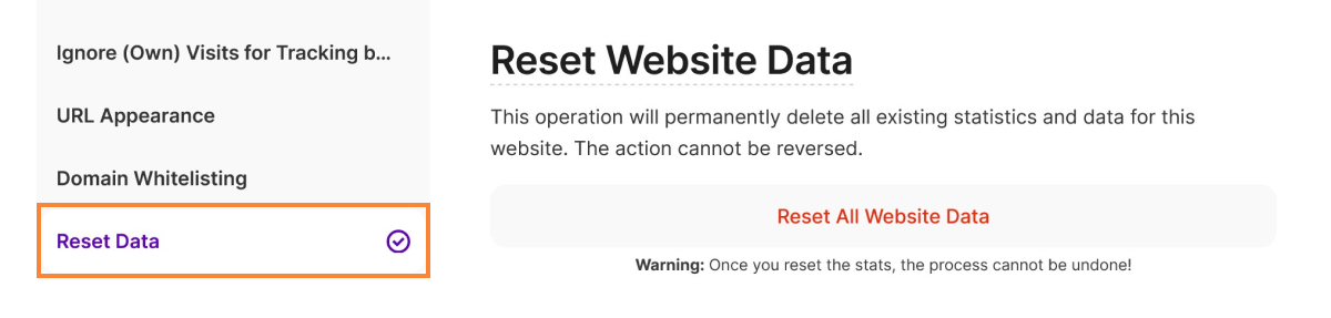 Resetting data will erase all your website stats, but your preferences will remain unchanged. If you opt to receive this data via email, we'll first send you a link containing your site stats archive and then proceed with the reset. Please note that these processes may take up to 24 hours, depending on your website traffic. While the reset is in progress, your stats will not be tracked.