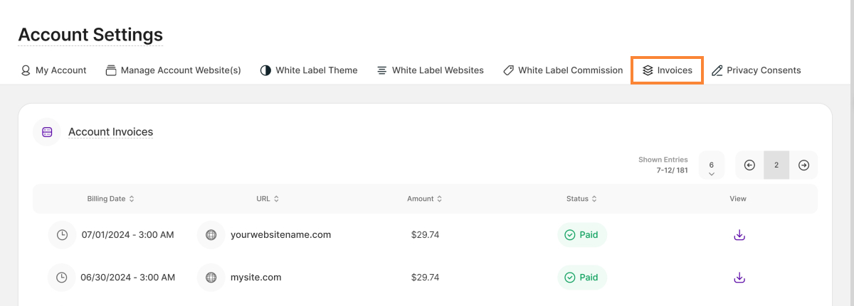 - Navigate to Account Settings and identify the website you wish to add the plan to.
