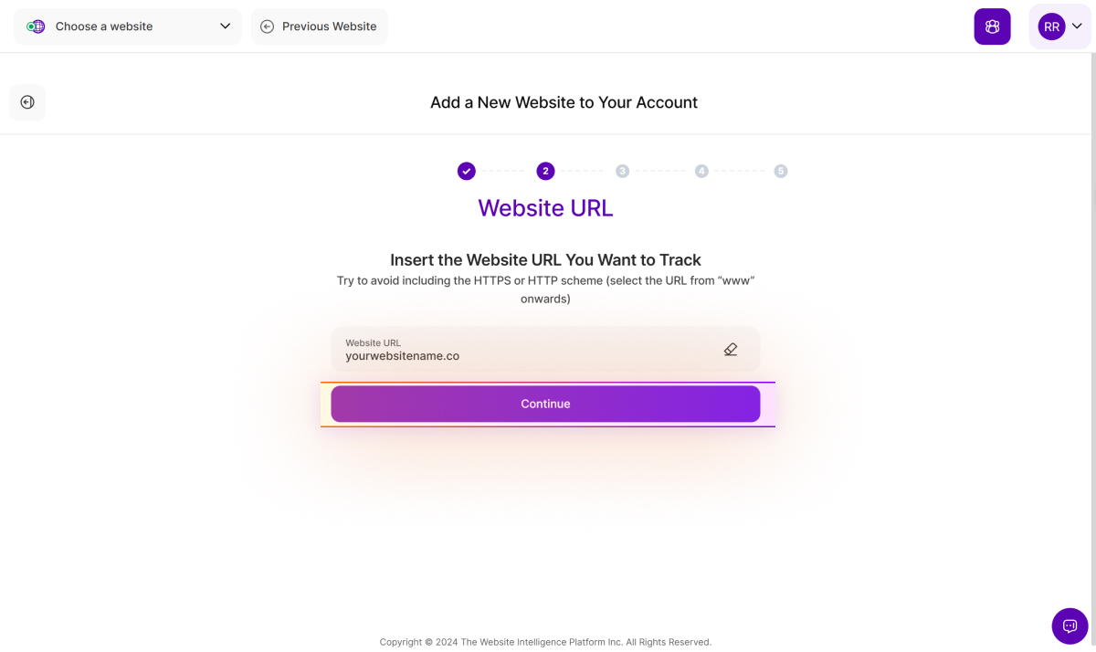4. After verification, you will be redirected to the TWIPLA platform. The next step is to insert the website's URL you want to track data for and click "Continue." For accuracy, we recommend copying the URL directly from your browser's address bar. Please copy the URL starting from "www" and omit the protocol (HTTP/HTTPS). This approach helps ensure that the URL is complete and correct.