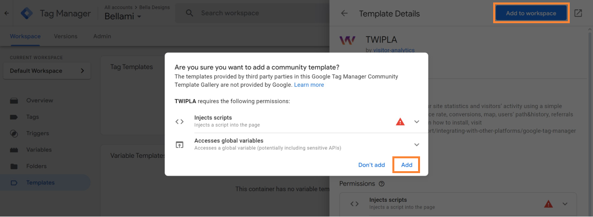 2. Find the TWIPLA template and click Add to workspace.