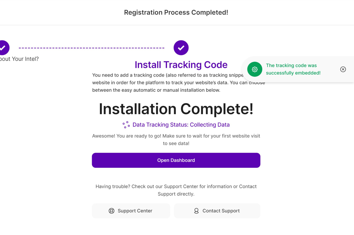 10. Go back to our app and click Verify Snippet Installation. Once successful, a message will pop up on the right of the screen saying, "The tracking code was successfully embedded!". If you get the message, "The tracking code could not be found in the body section of your website's source!", check your website's source code to make sure that the tracking code was installed correctly.